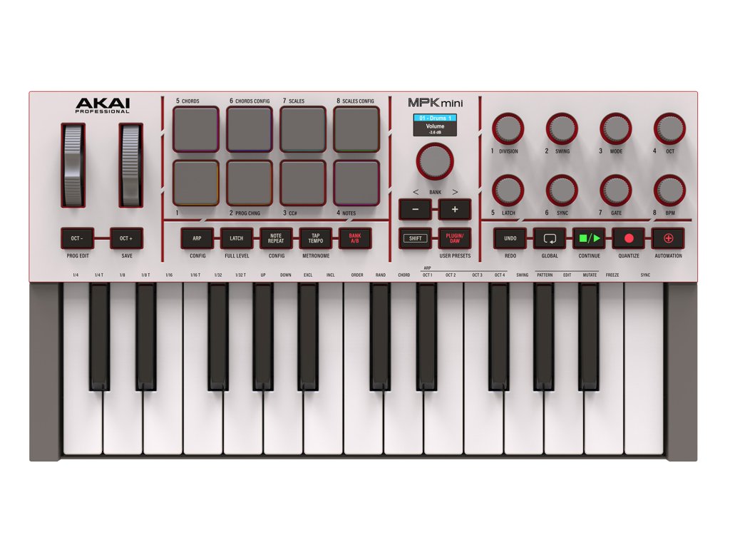 USB MIDI klaviatura s dynamickými klávesami, 8 MPC pady, otočné ovladače, arpeggiátor, kolečka Pitch a Modulation, připojení USB-C, MIDI výstup, režimy Scale a Chord, barevný displej, bílá