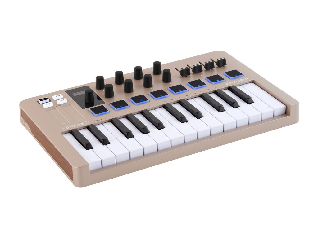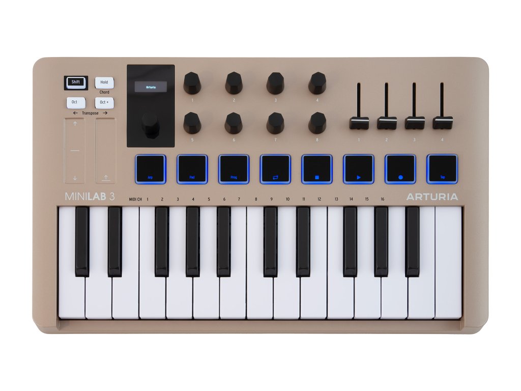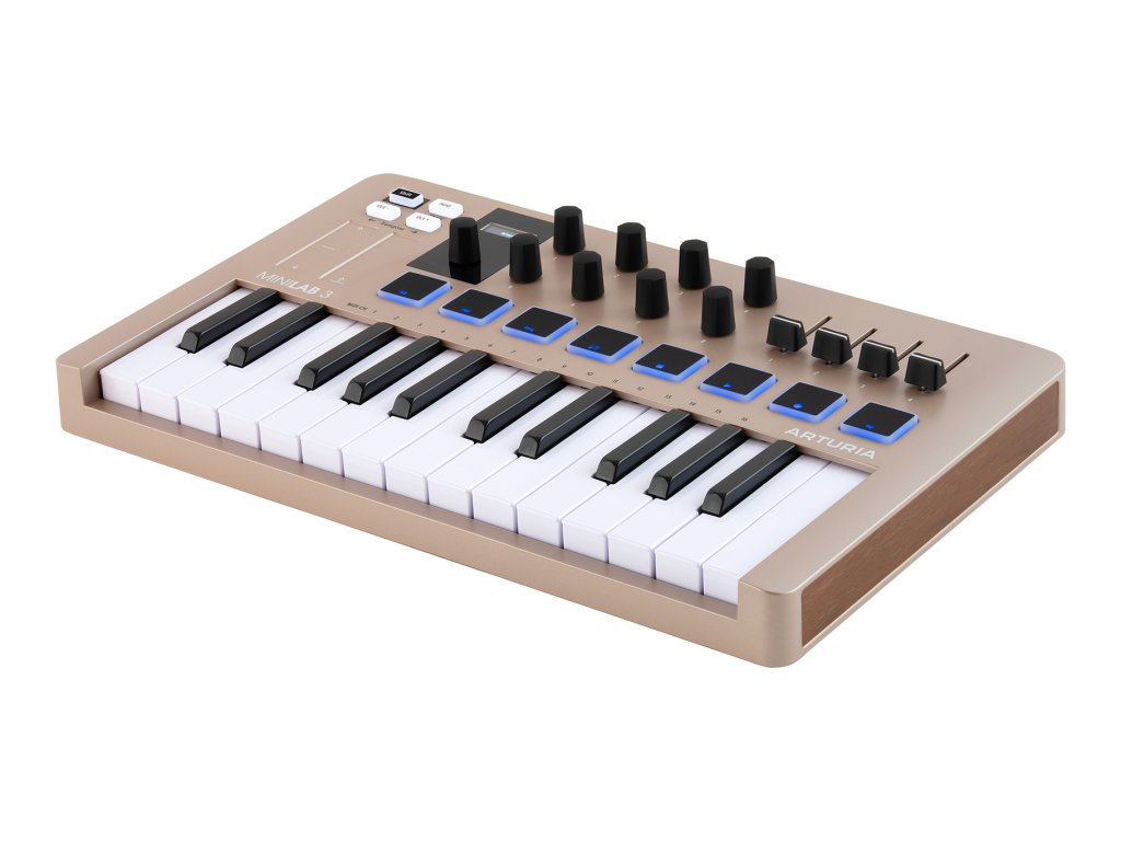 Univerzální klávesový MIDI kontroler, 25 dynamických slim kláves, Pitch Bend a Modulation jako dotykové pásky, 8 otočných enkodérů, 4 tahové ovladače, 8 RGB podsvícených multifunkčních padů, funkce transportních tlačítek na padech, vstup pro control pedál, MIDI Out na DIN, USB-C, bytelná konstrukce pro dlouhou životnost, barevné provedení champagne, limitovaná edice