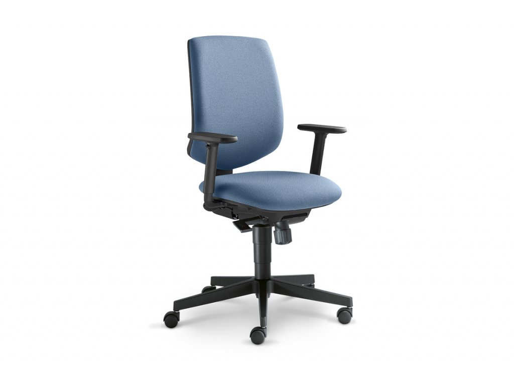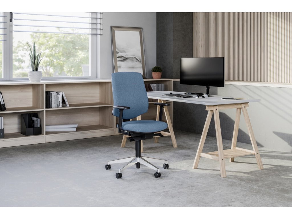 Praktická otočná židle určená do studia, multimediálních pracovních stanic nebo kanceláří. Čalouněný šedomodrý sedák i opěrák s nastavením tuhosti, výškově stavitelné područky.