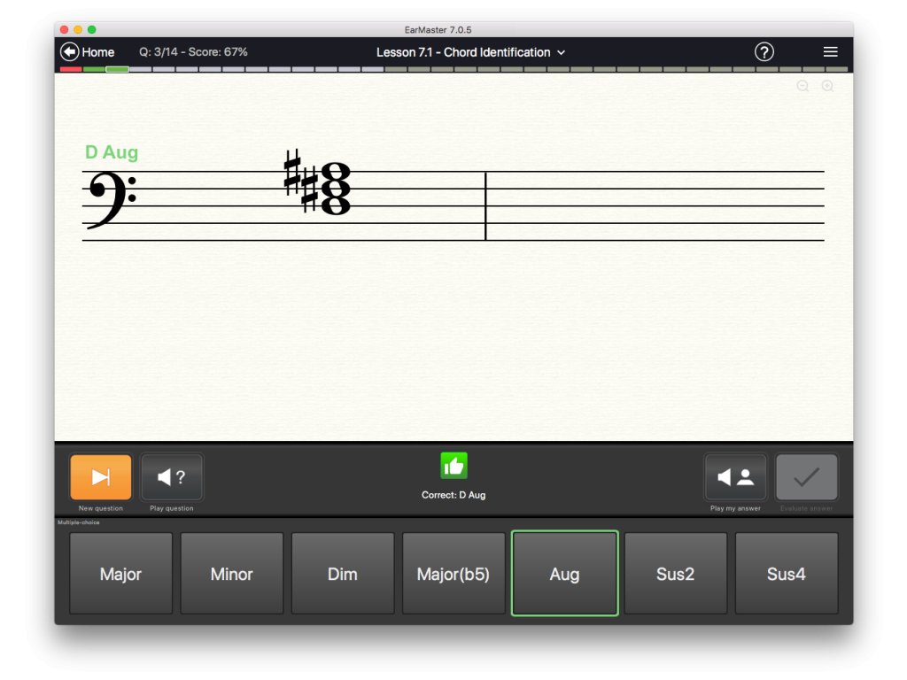 - Kompletní cvičení hudebního sluchu zahrnující intervaly, akordy, obraty akordů, stupnice, harmonické postupy, melodie, rytmy a další.