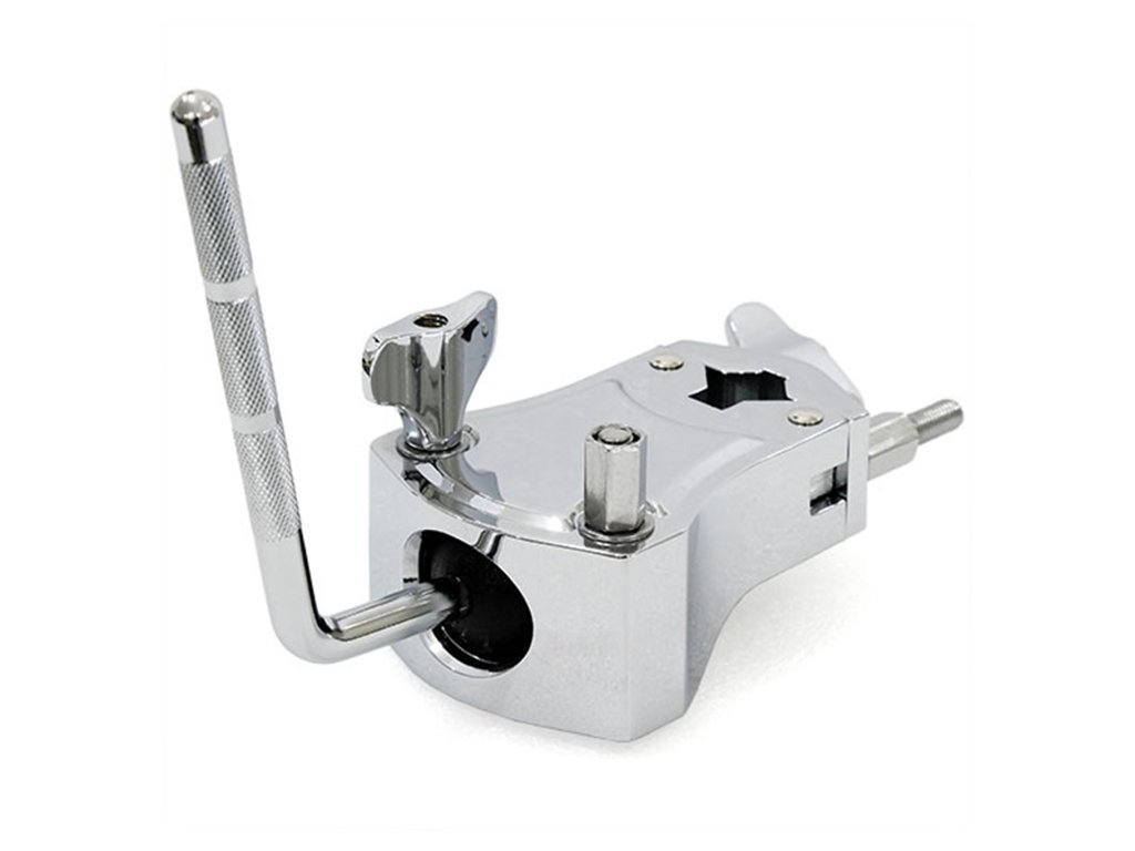 Držák pro tomový pad i reálný tom, kulový kloub, L-rod tvar, vroubkovaná ocelová tyč, průměr L-rod 10 mm, montáž na trubky 19,1–31,8 mm, robustní konstrukce, chromovaný povrch