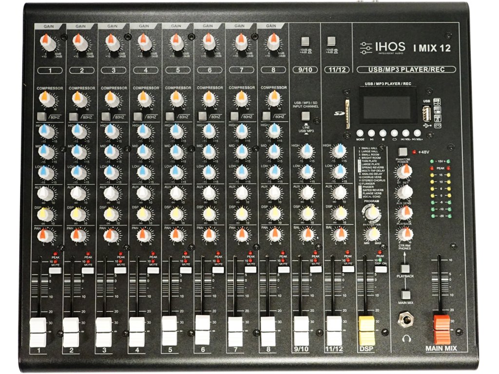 mixážní pult, 8x Mic/line, 2x line stereo, Aux, DSP, EQ na vstupech, sluchátka, 2-Track In/Out, Control Room, USB/SD přehrávač/rekordér