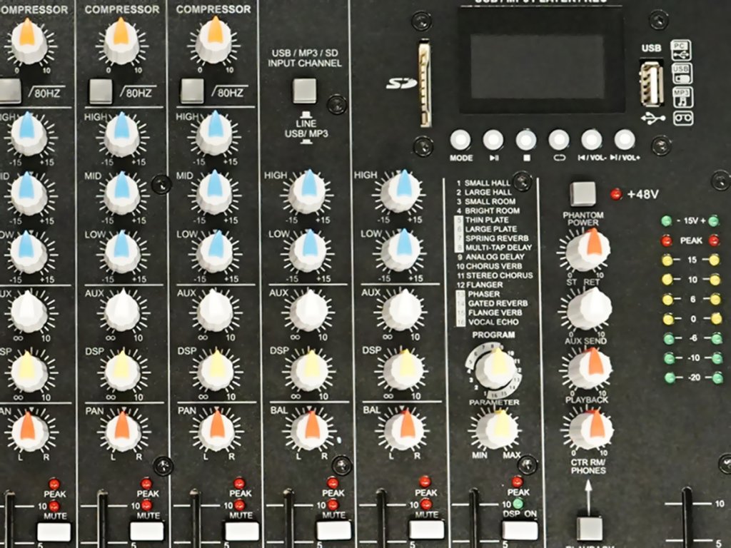 Mixážní pult, 8x Mic/Line, 2x Line stereo, Aux, DSP, EQ na vstupech, sluchátka, 2-Track In/Out, Control Room, USB/SD přehrávač/rekordér