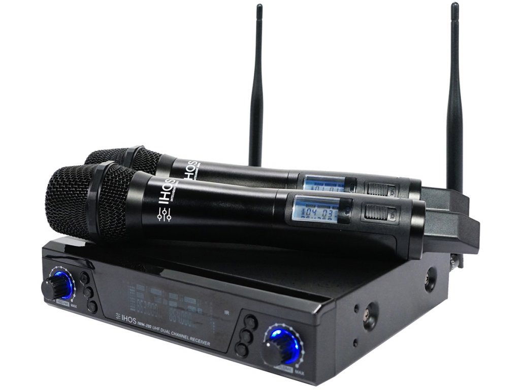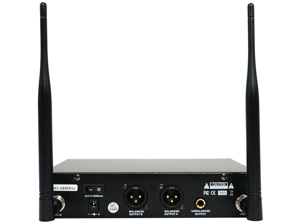 Dvojokanálový bezdrátový mikrofonní systém UHF True Diversity, frekv. pásma 863-865 MHz, PLL syntéza, IR synchronizace, LCD displej zobrazuje stav frekvence, AF a RF signál, 150m operační dosah, dynamické mikrofony