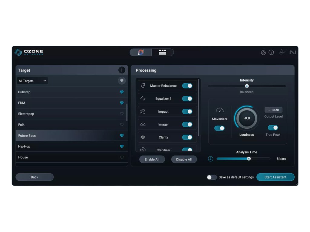 Pokročilá možnost přizpůsobení asistovaného masteringu, včetně výběru cílových platforem, žánrů a stylu zpracování.