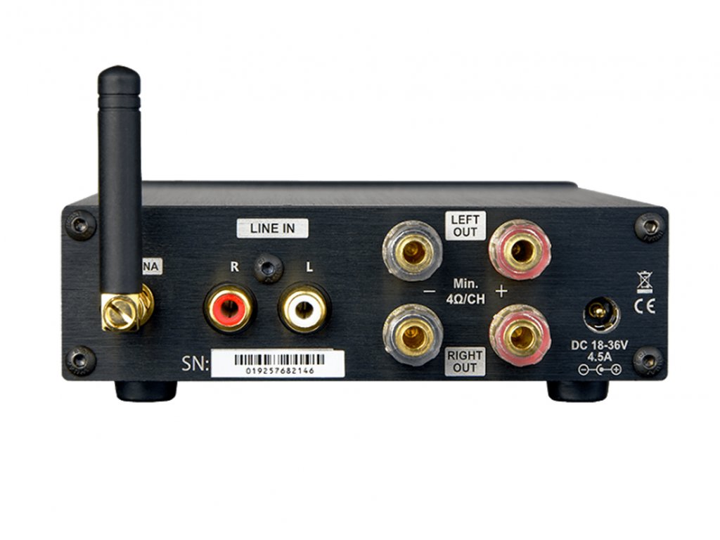 Kompaktní výkonový stereofonní zesilovač, 2x 160 W, 4 Ω – 16 Ω, vstup 2x RCA, výstup 4x zlacené šroubovací konektory, Bluetooth, externí napájecí zdroj
