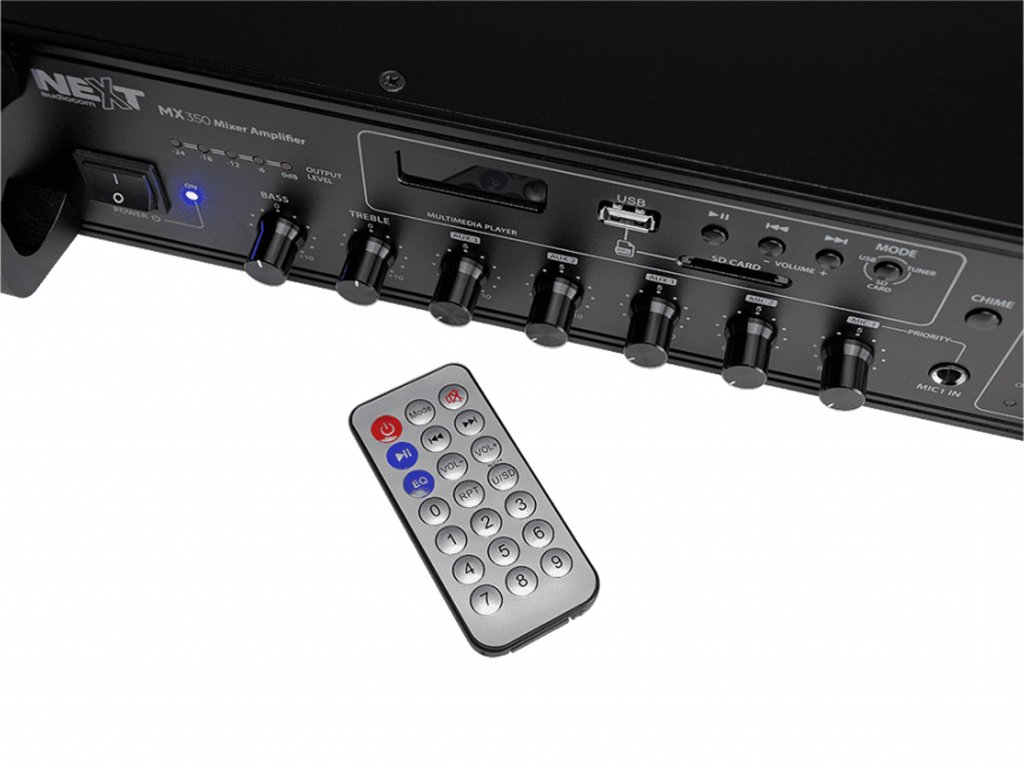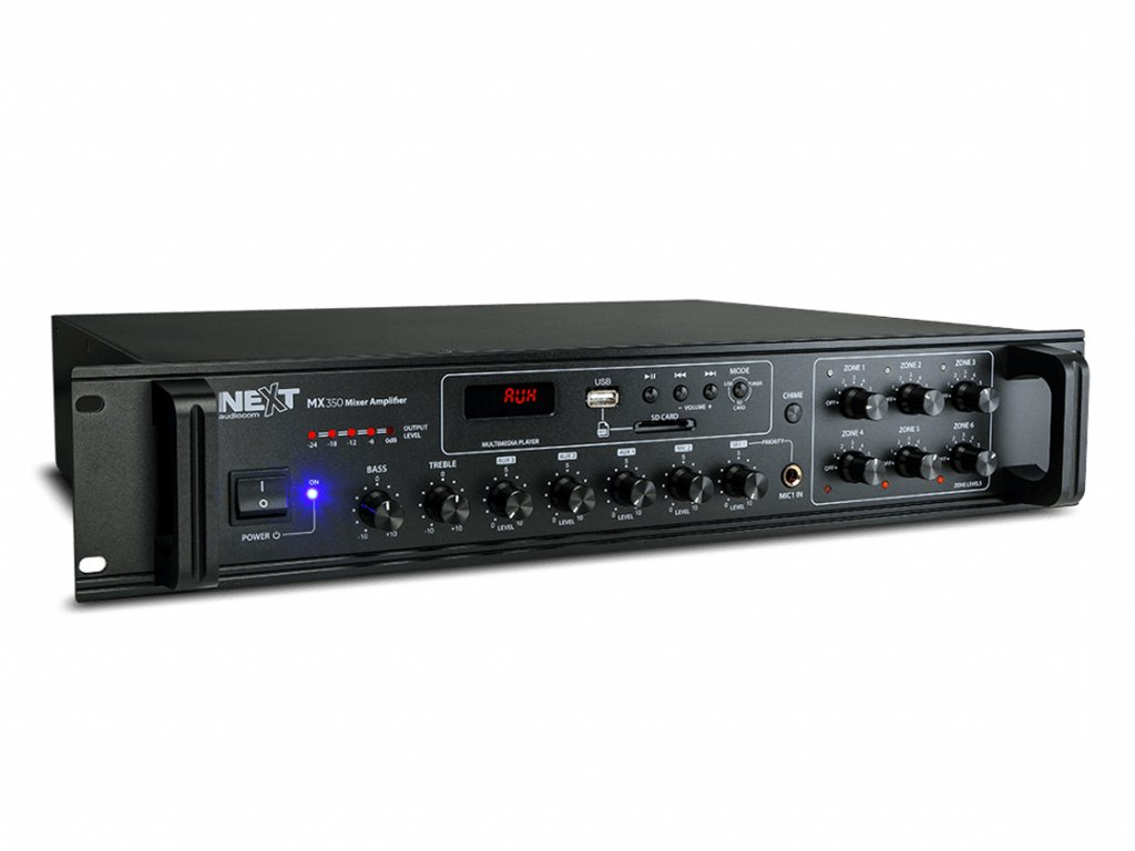 je 6 zónový směšovací zesilovač, 350 W [100 V | 8 Ω] pro středně velké a velké instalace. MX 350 můžete provozovat pro zátěž 4 – 16 Ω nebo 70 V / 100 V. Umí ovládat až 6 zón zcela nezávisle s celkovým výkonem až 350 W. S integrovaným přehrávačem je možné vložit USB flash disk nebo SD kartu a přehrávat zvukové soubory přímo na zařízení. Vstup MIC umožňuje připojení mikrofonu přes TS 6,3 (velký jack).