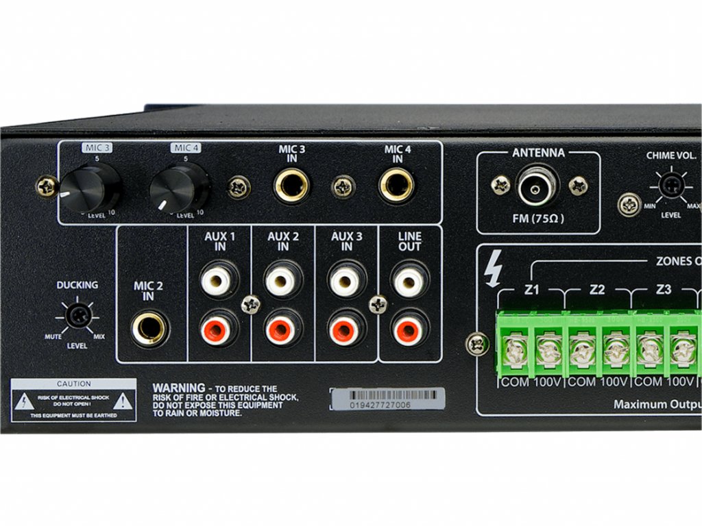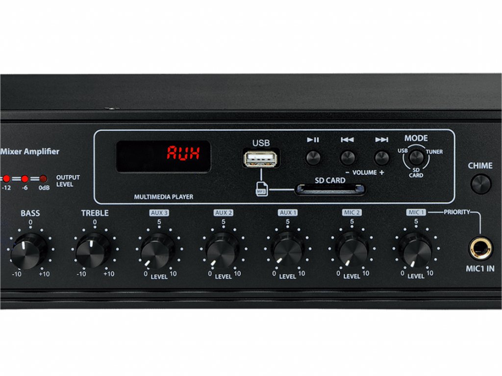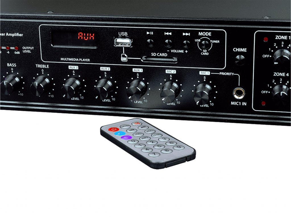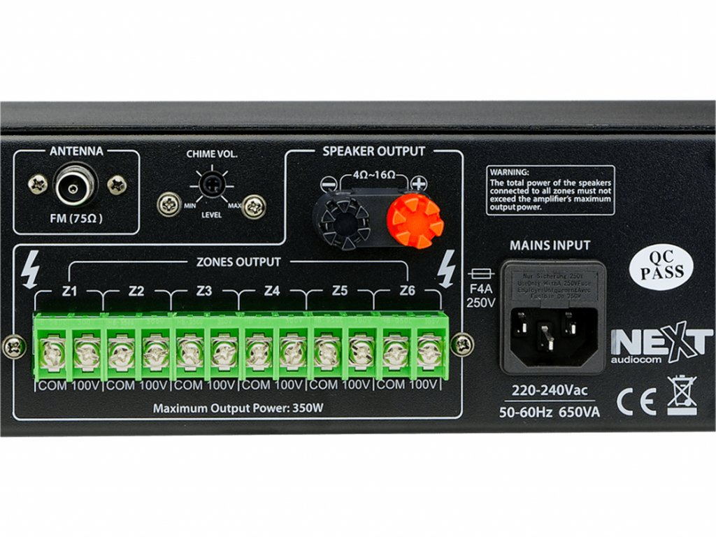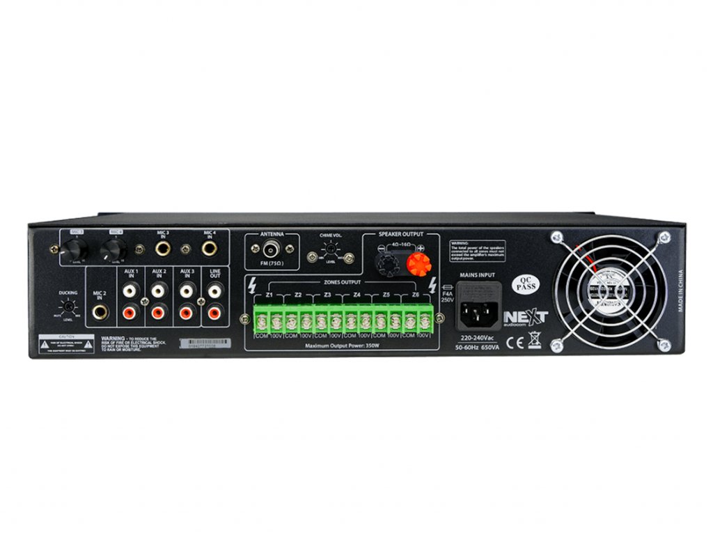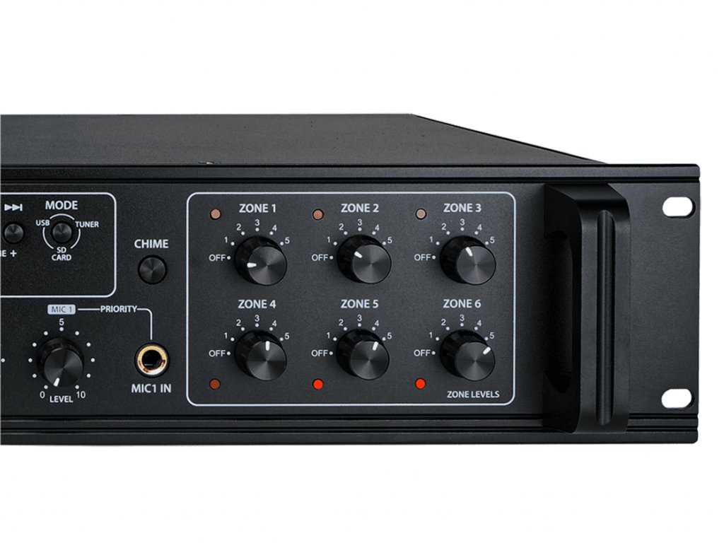 Zónový výkonový zesilovač pro instalace, 6 zón, 350 W / 100 V, 8 Ohm, směšovač vstupů - 3x stereo (RCA), 4x MIC (TS), USB, Slot pro SD kartu, FM anténa (75Ω), nastavení priority vstupů, linkový výstup na 2x RCA (cinch), USB-A a SD slot s přehrávačem mediálních souborů, dálkové ovládání, zónové výstupy na konektorech Phoenix, výkonový výstup na šroubovacích konektorech, interní napájecí zdroj