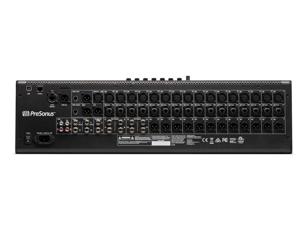 24 combo XLR/TRS vstupů, 8 TRS linkových vstupů, RCA tape in/out, 6 XLR a 4 TRS výstupy pro FlexMix sběrnice, hlavní L/R a Mono výstupy (XLR), TRS monitor výstup, TRS sluchátkový výstup, USB 2.0, SD, AES/EBU a AVB Ethernet.