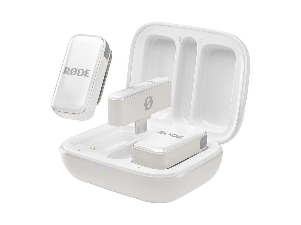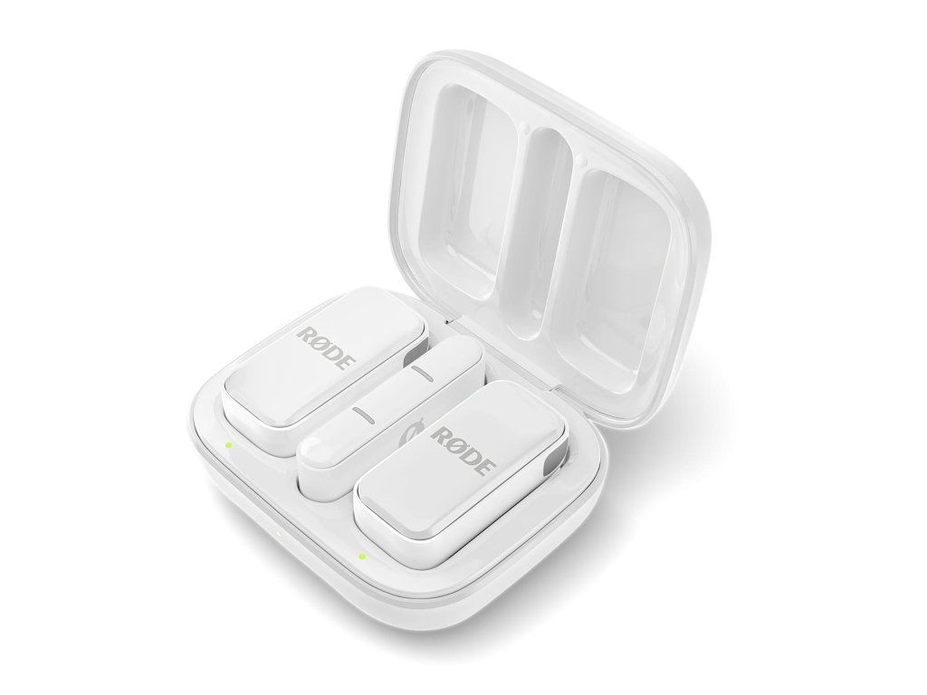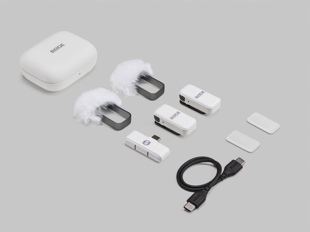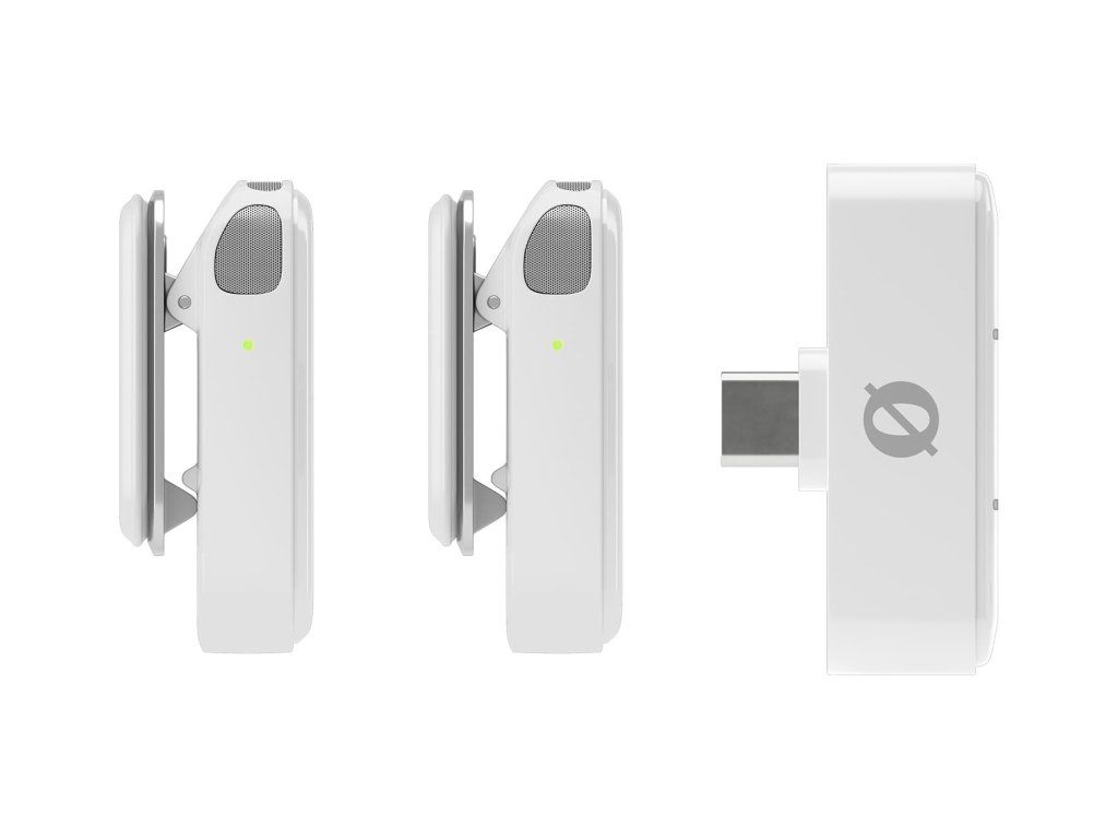 Kompaktní dvoukanálová bezdrátová sada 2x vysílač + 1x duální přijímač, pro nahrávání zvuku do smartphonu pomocí USB-C, digitální přenos, dosah 100 m, interní mikrofony na vysílačích, včetně dobíjecího docku Charge Case, protivětrných ochran, magnetických klipů a nabíjecího USB-C kabelu, podpora iOS i Android, bílé provedení