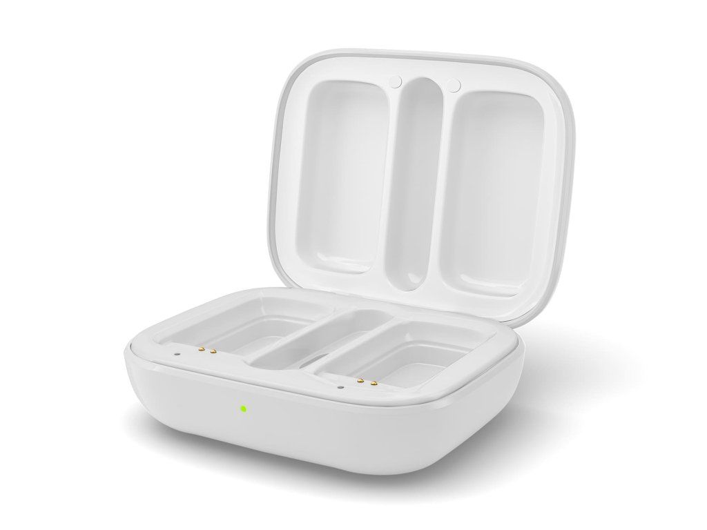 je ochranné přepravní pouzdro pro oba vysílače i přijímač. Současně funguje jako dobíjecí dok, který během dopravy nebo natáčecí pauzy zajistí dobití vysílačů. Může být napájen přibaleným USB-C kabelem, nebo pro dobíjení můžete použít interní akumulátor, který zvládne dvojí plné dobití všech komponent setu.