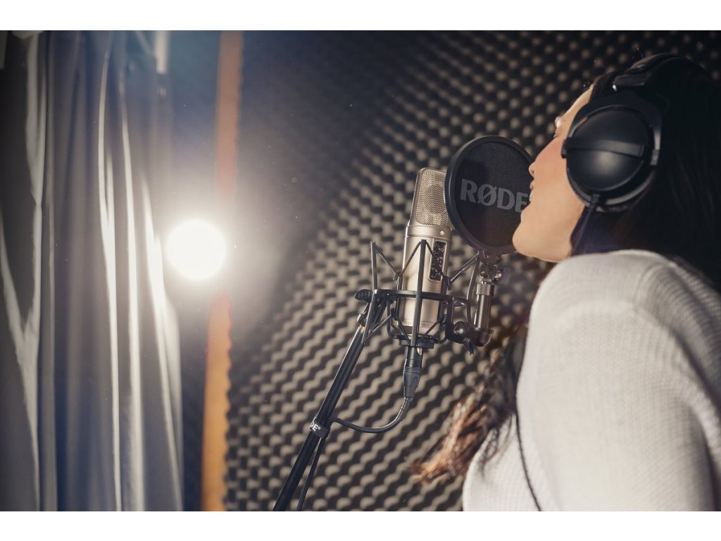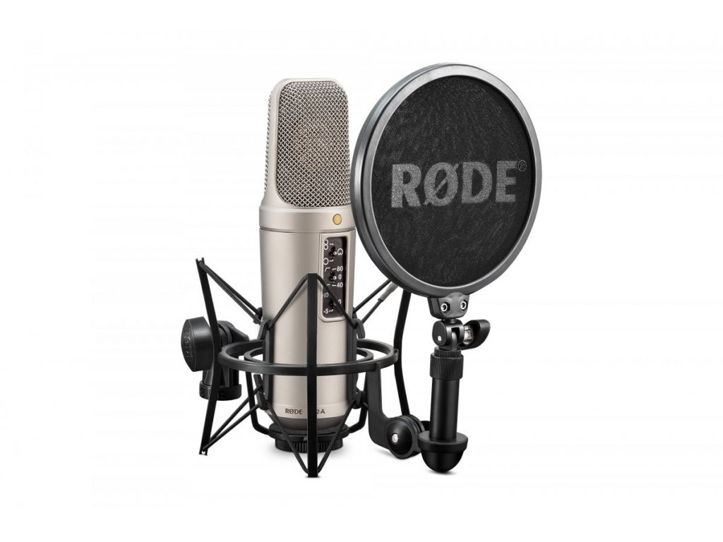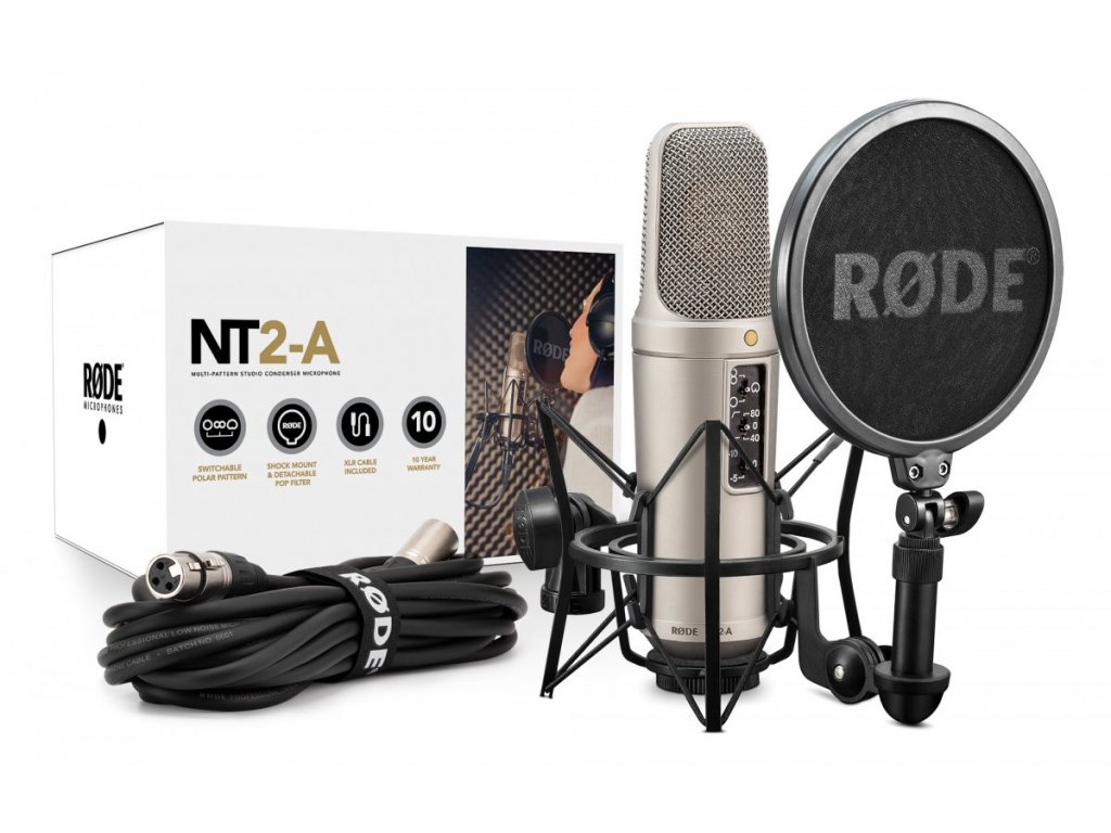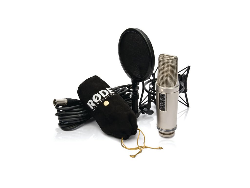 je sada obsahující profesionální velkokapacitní studiový mikrofon NT2-A s 1" kapslí, shock mount s pop filtrem RODE SM6, 6 m XLR kabelem, protiprachový obal