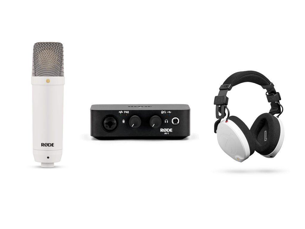Prémiový studiový bundle, 1x RØDE NT1 5th Generation White, 1x RØDE NTH-100 (White), 1x RØDE SM6, vhodný pro profesionální a domácí studia, zpěv, mluvené slovo, hudební produkci, barevná varianta: bílá