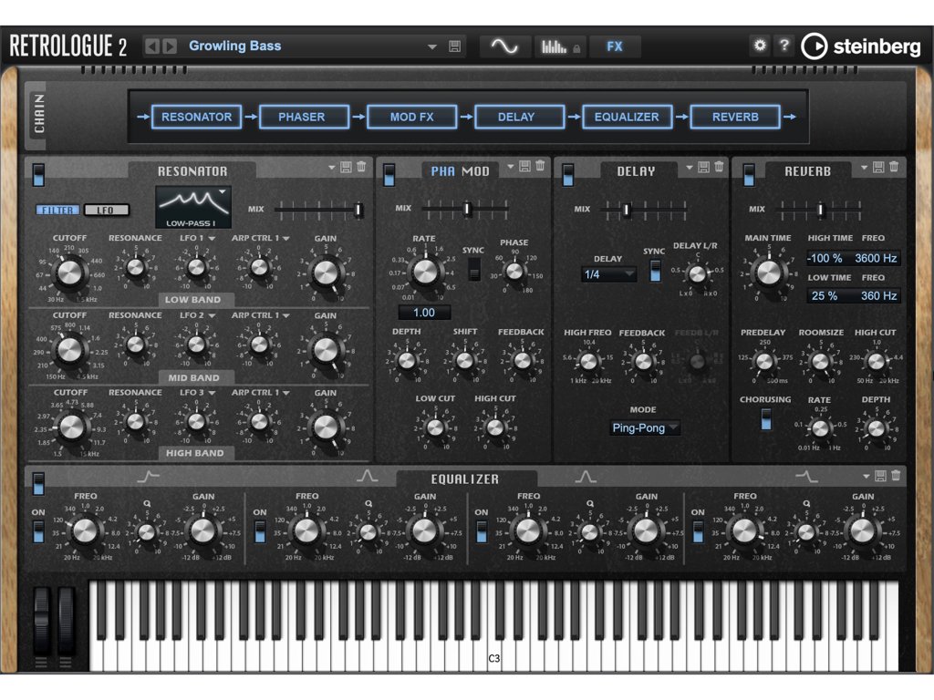 - šest efektů v sérii: resonator, phaser, chorus/flanger/ensemble, delay, reverb, EQ